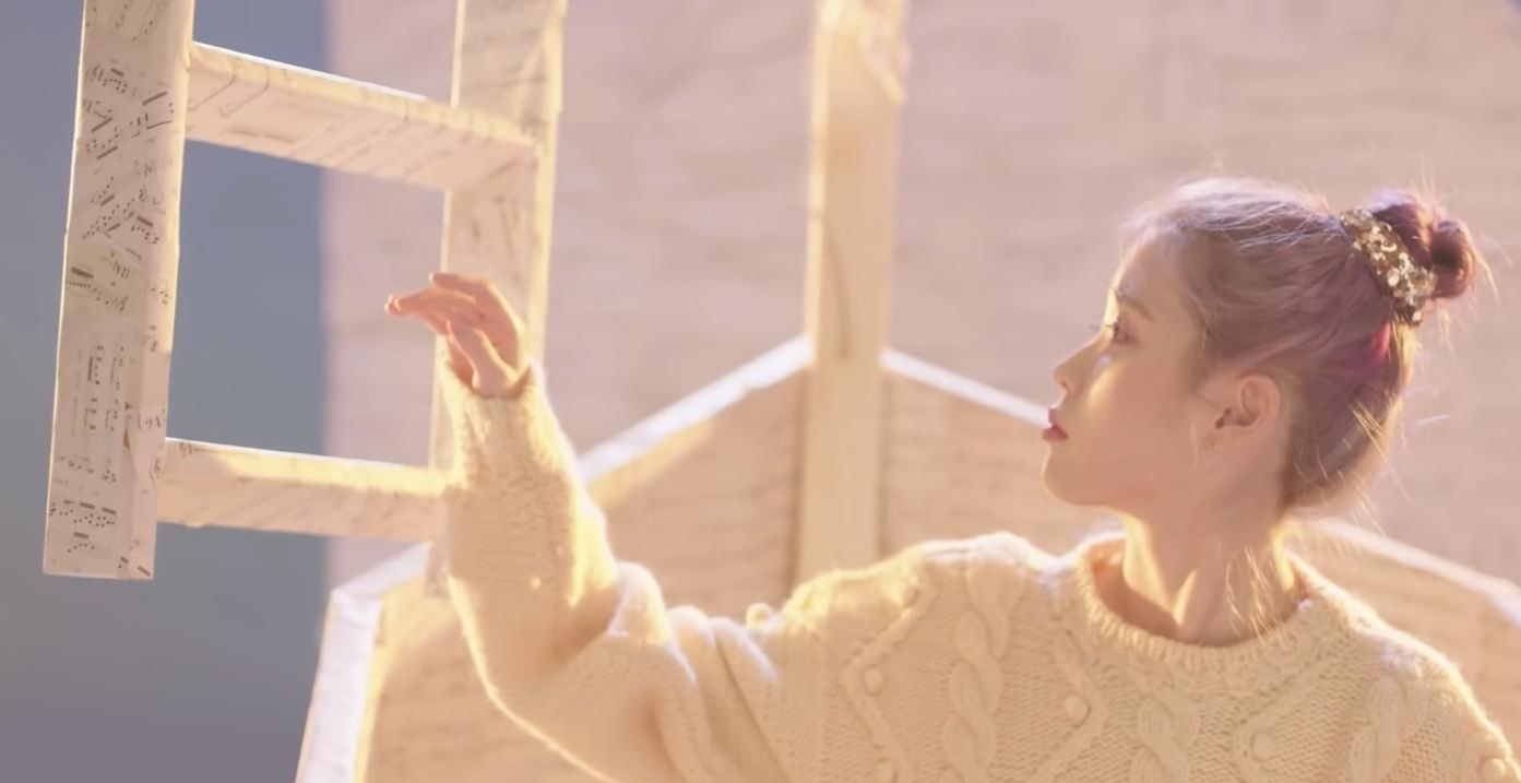 내려지는 사다리를 잡는 아이유의 모습.